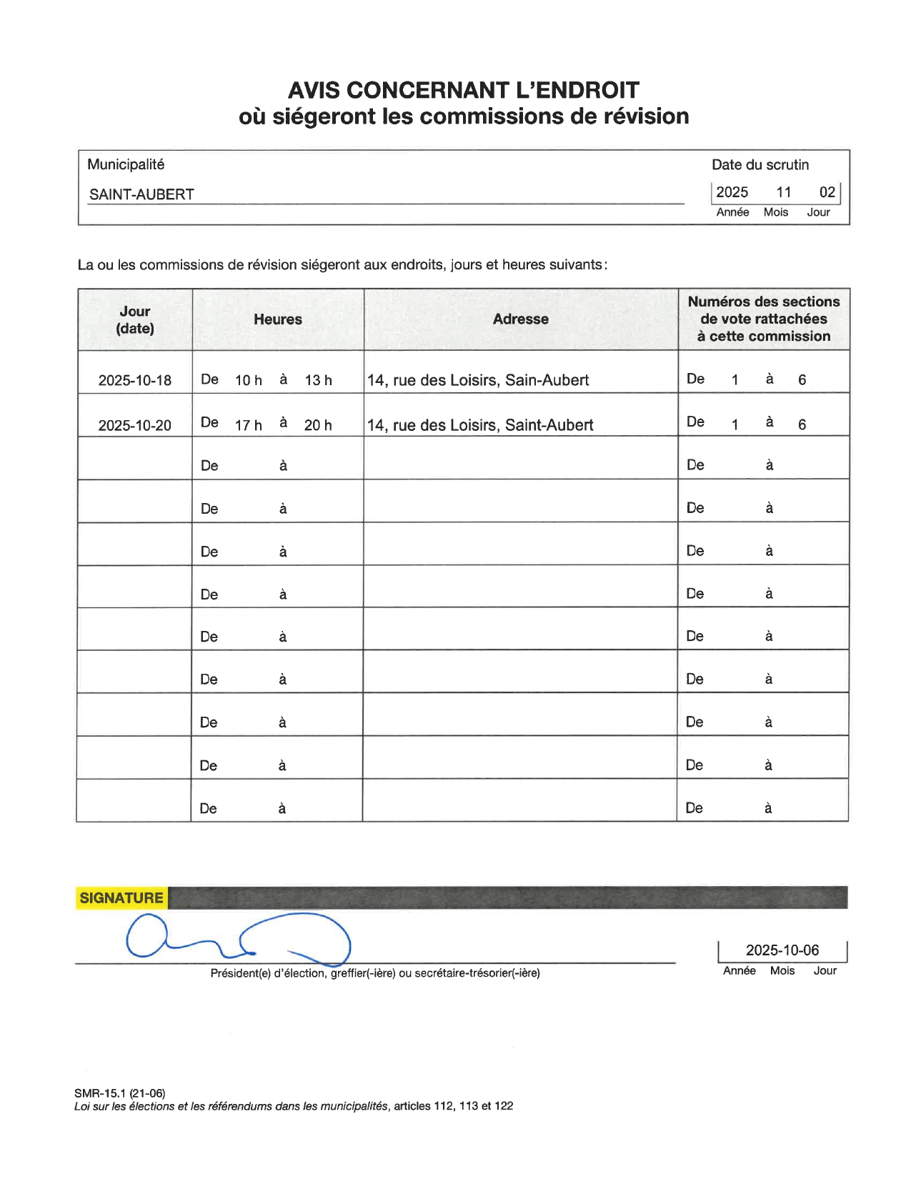 Avis concernant l'endroit où siégera la commission de révision de la liste électorale