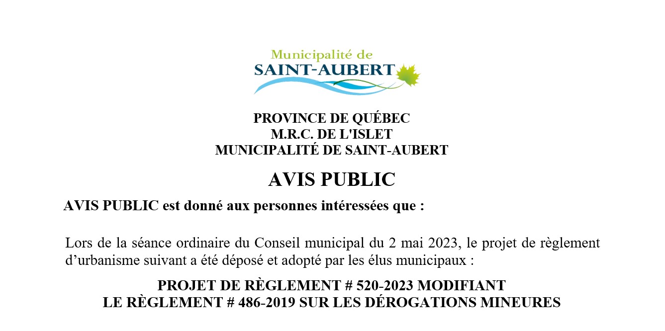 Projet de règlement # 520-2023 modifiant le règlement # 486-2019 sur les dérogations mineures