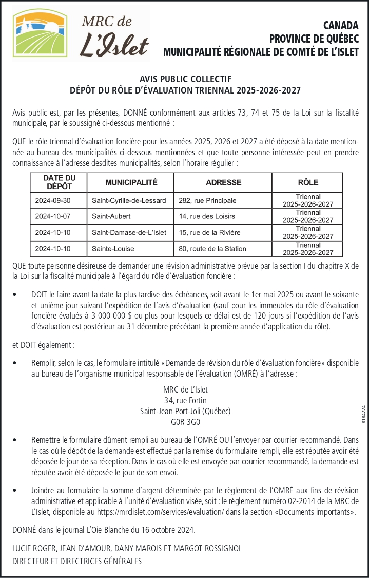 AVIS PUBLIC - Dépôt du rôle d'évaluation triennal 2025-2026-2027
