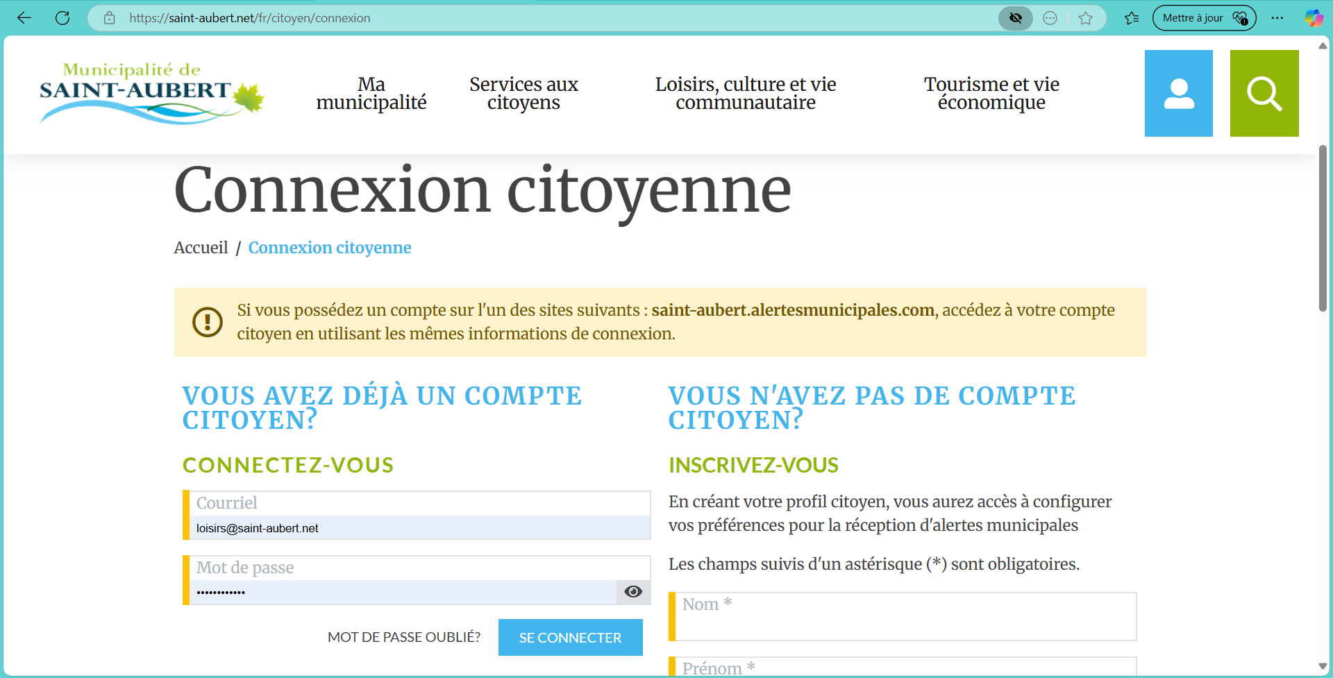- Pour être identifiés comme tels, les résidents de Saint-Aubert doivent avoir rempli les champs de leur adresse civique dans leur compte Connexion Citoyen sur le site de la Municipalité de Saint-Aubert en utilisant le résultat de la recherche Google. Si vous possédez un compte sur l'un des sites suivants : saint-aubert.alertesmunicipales.com, accédez à votre compte citoyen en utilisant les mêmes informations de connexion. Il n'est pas trop tard pour faire la correction au besoin dans votre profil.