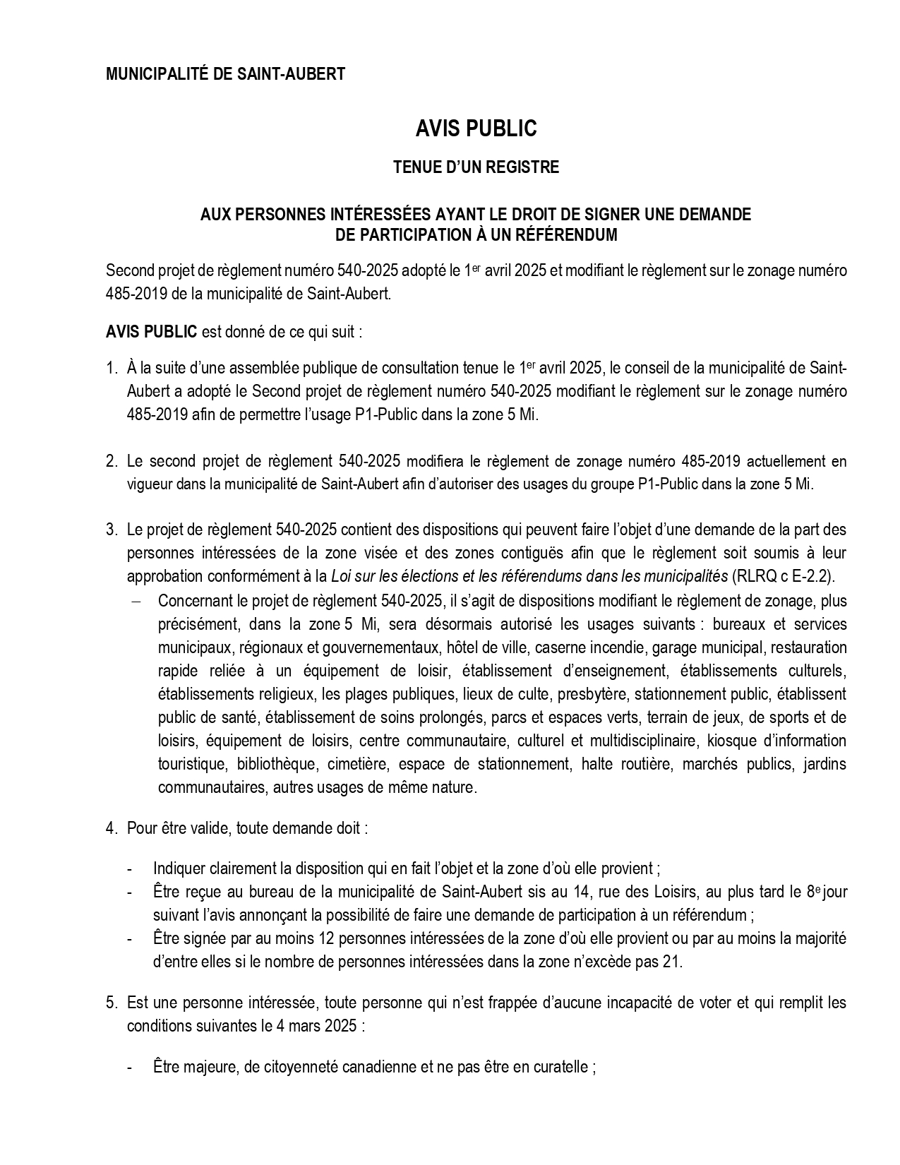 Avis public - Tenue d'un registre aux personnes intéressées ayant le droit de signer une demande de participation à un référendum - 540-2025