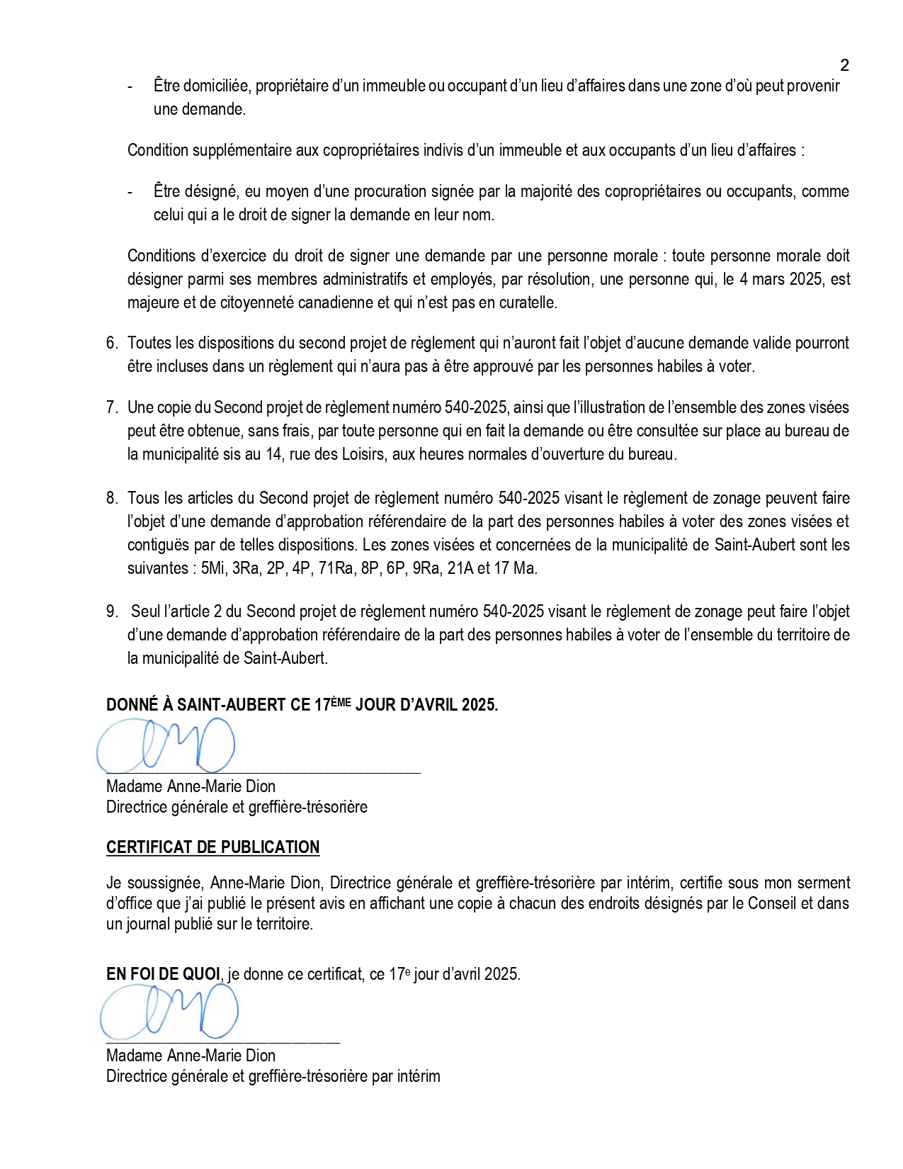 Second projet de règlement No 540-2025 adopté le 1er avril 2025 et modifiant le règlement sur le zonage numéro 485-2019 de la municipalité de Saint-Aubert