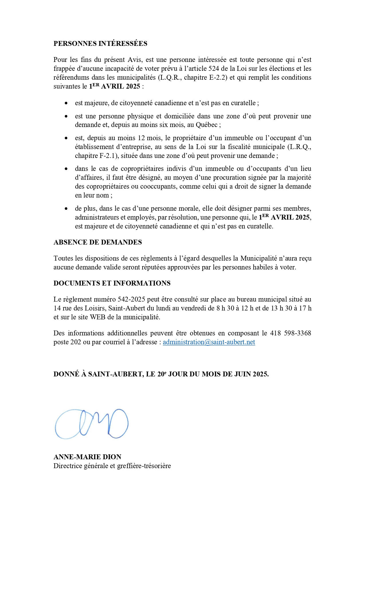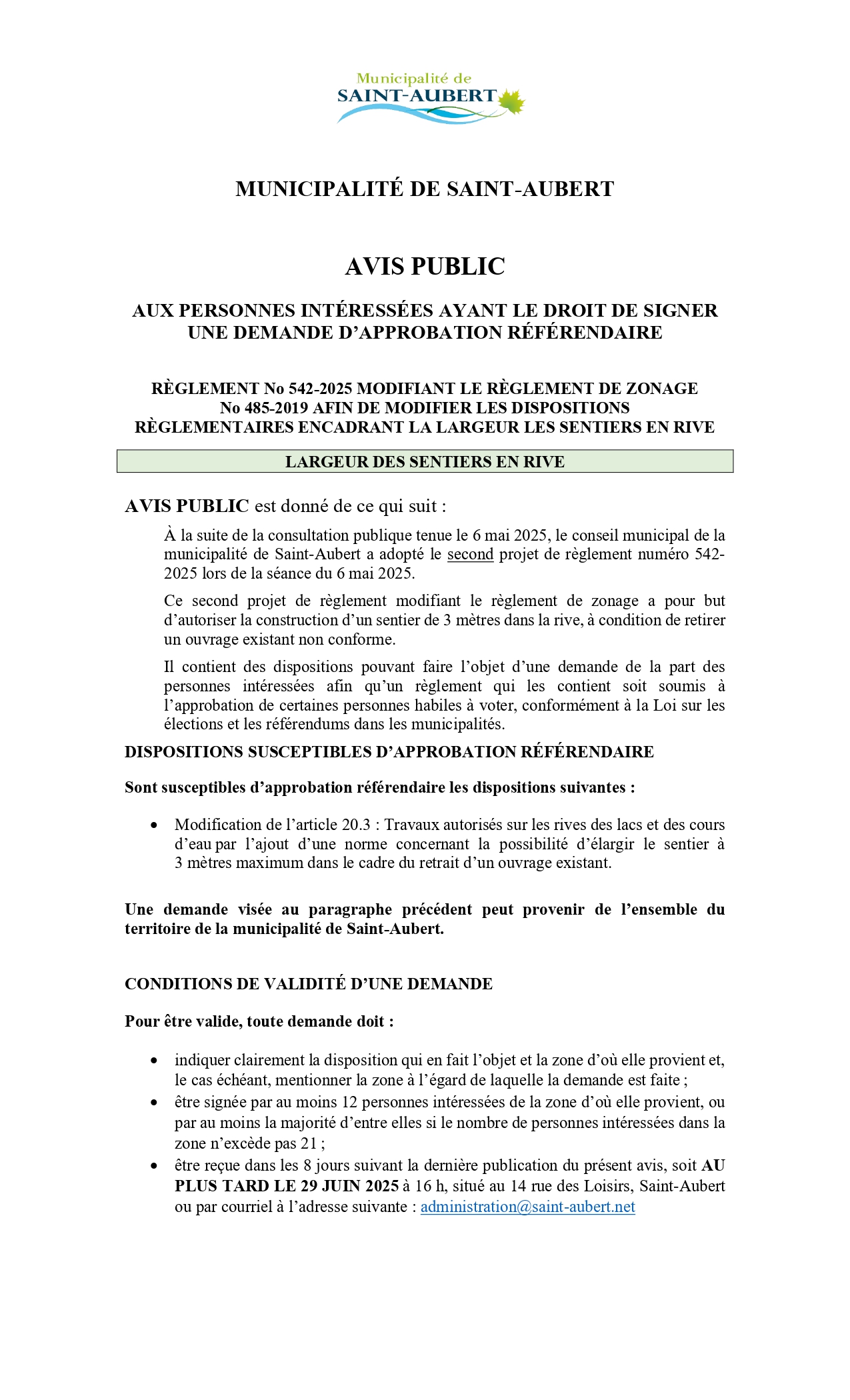 AVIS PUBLIC pour l'approbation référendaire du règlement 542-2025