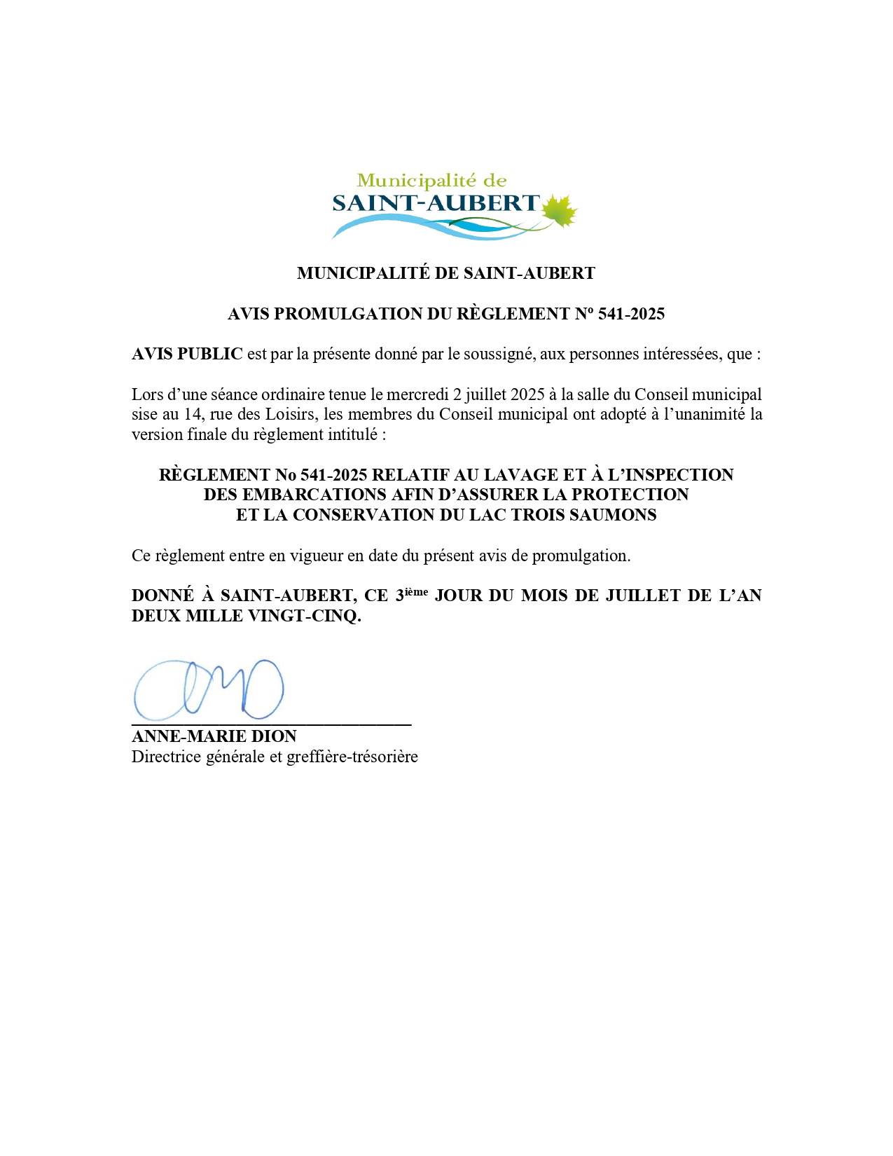 Avis de promulgation - Règlement 541-2025 relatif au lavage et à l'inspection des embarcations afin d'assurer la protection et la conservation du lac Trois Saumons