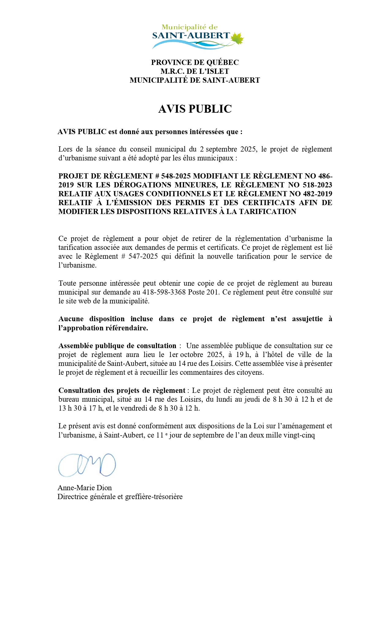 AVIS PUBLIC - CONSULTATION PUBLIQUE - PROJET DE RÈGLEMENT 548-2025