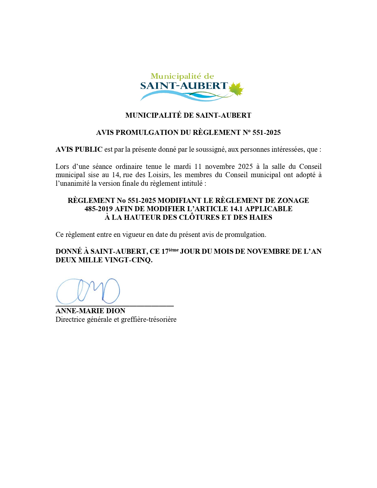 Avis de promulgation - Règlement 551-2025 modifiant le Règlement de zonage 485-2019 afin de modifier l'article 14.1 applicable à la hauteur des clôtures et des haies